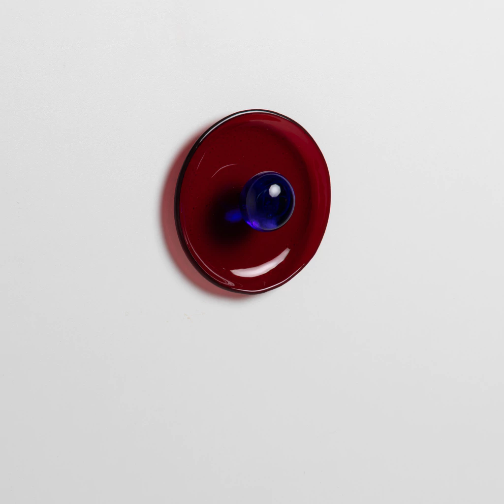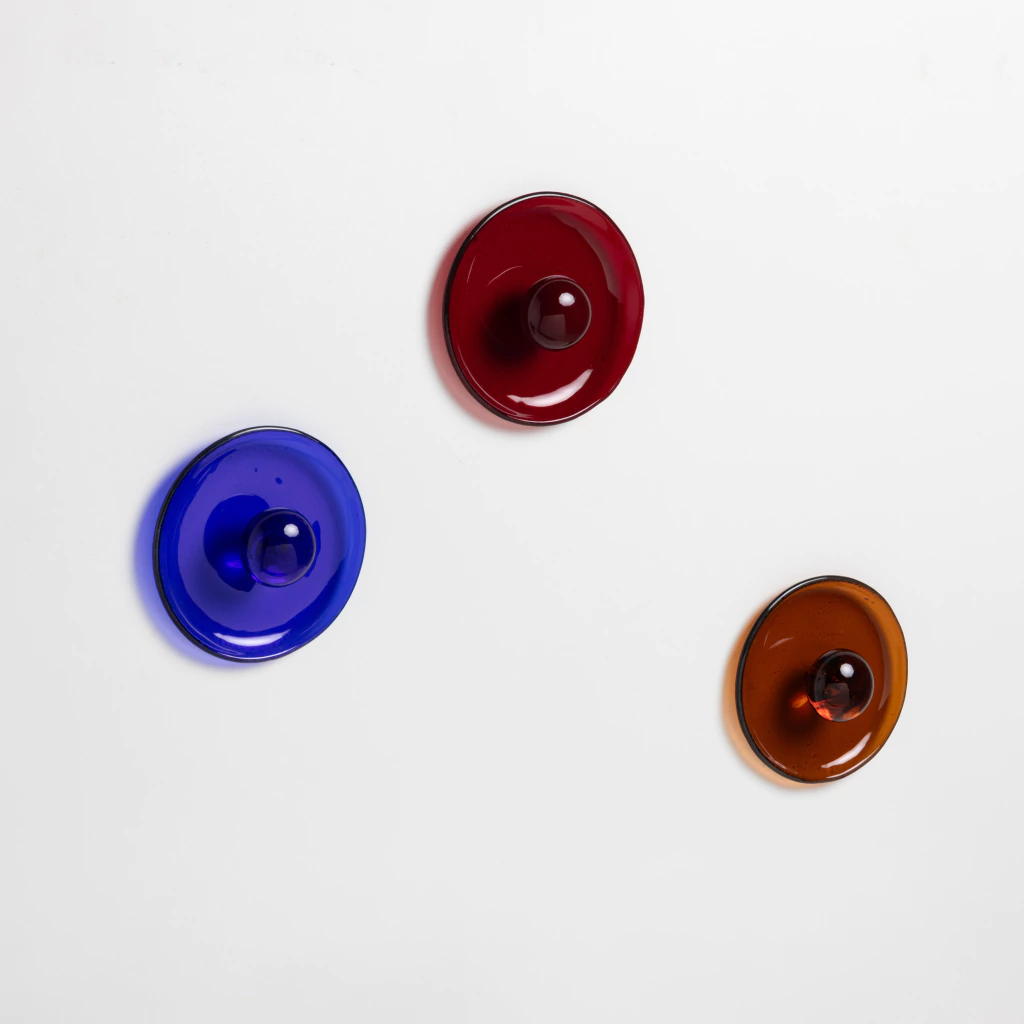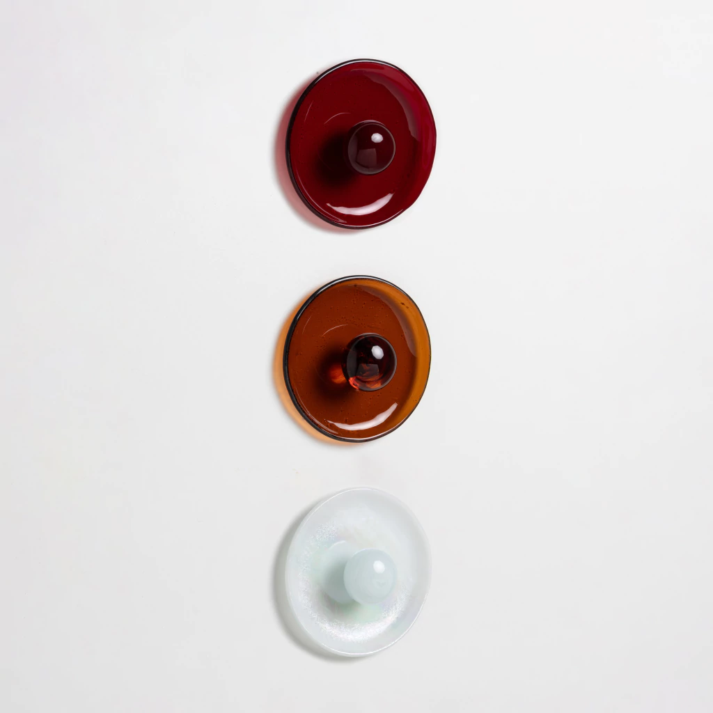 Sua base é feita em vidro moldado e sua esfera é confeccionada manualmente no maçarico, garantindo acabamento artesanal e variações sutis entre as peças.