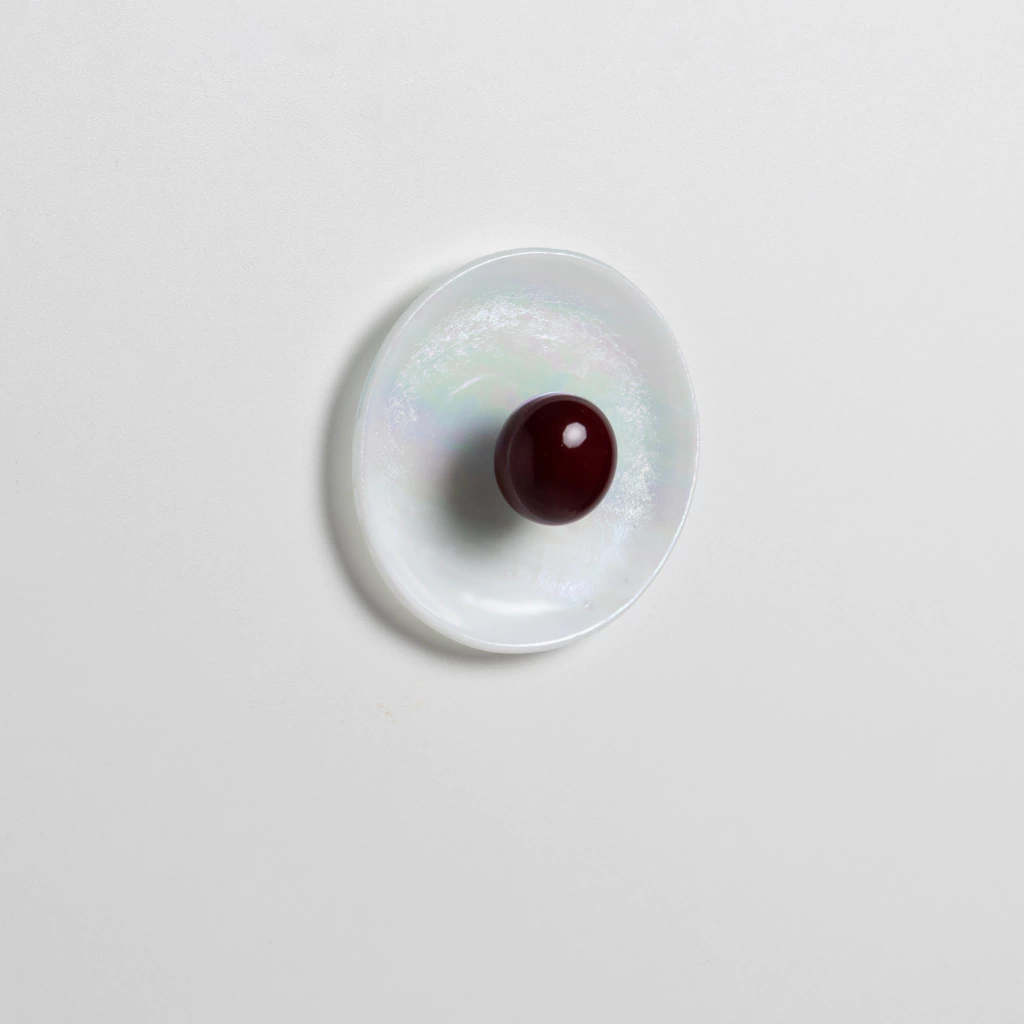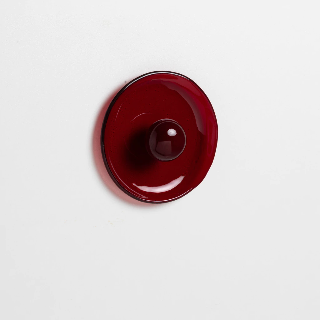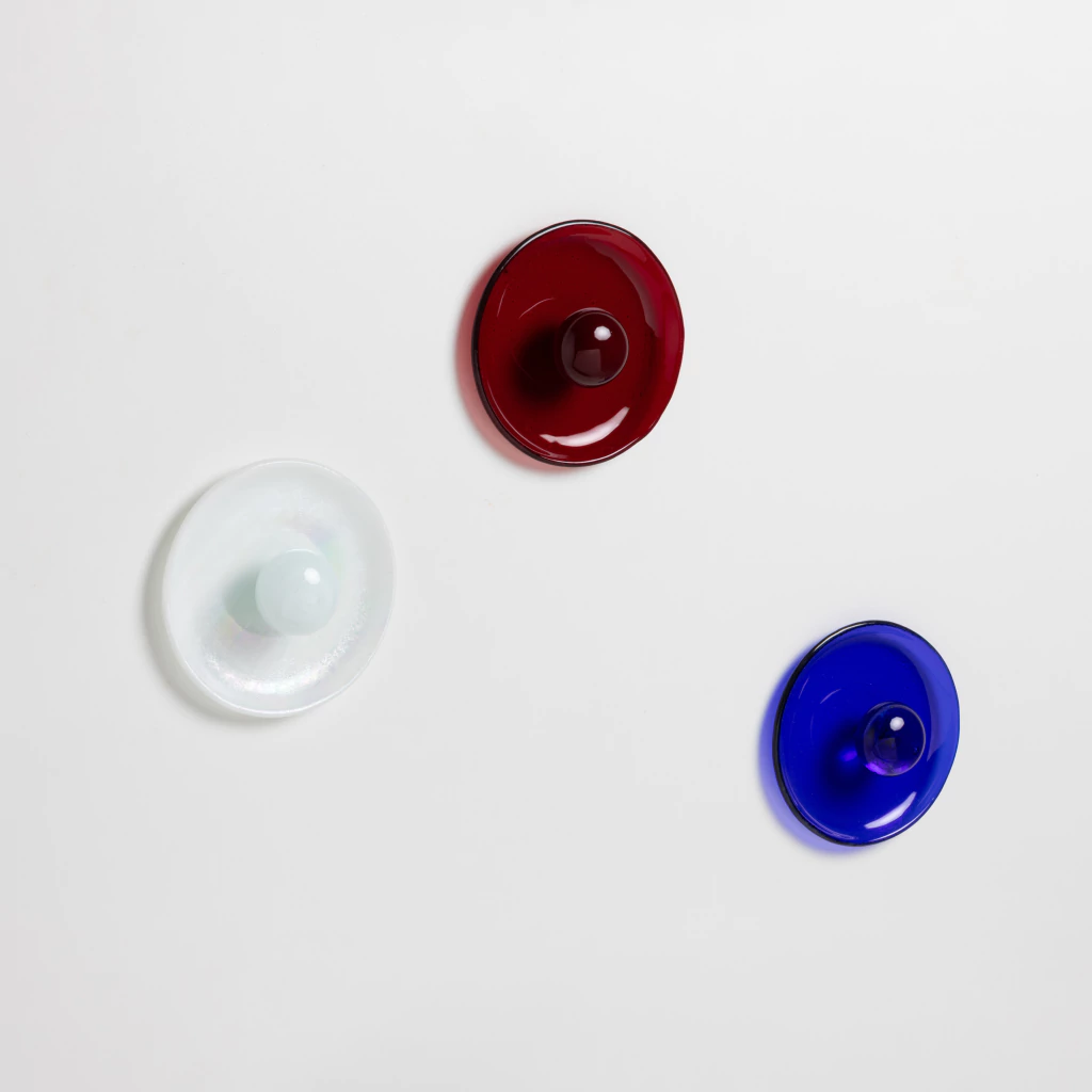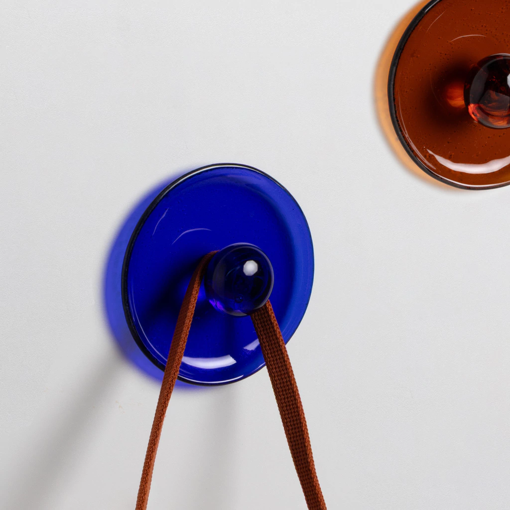 Sua base é feita em vidro moldado e sua esfera é confeccionada manualmente no maçarico, garantindo acabamento artesanal e variações sutis entre as peças.